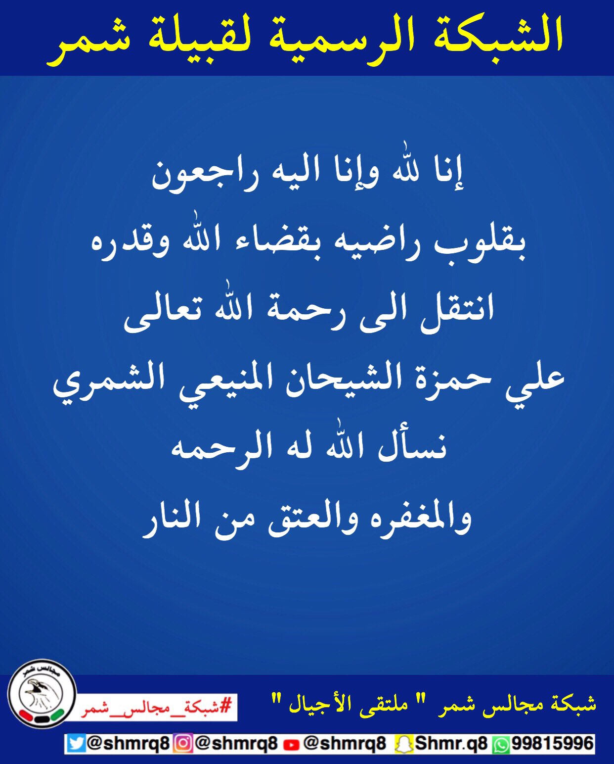 سارة الشيباني Di Twitter بقلوب مؤمنة راضية بقضاء الله وقدره انتقل إلى رحمة الله خالي رحمه الله رحمة واسعة واسكنه فسيح جناته إنا لله وإنا إليه راجعون Https T Co Sm8dzqdkkn