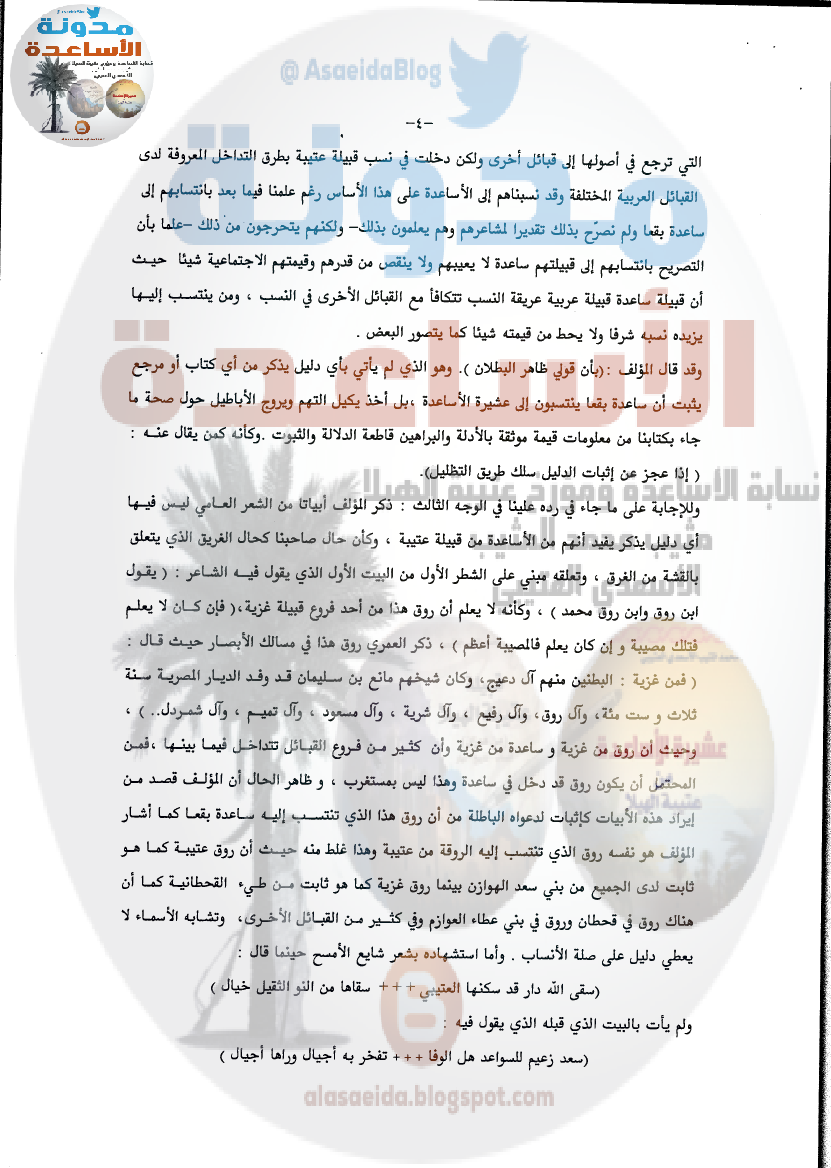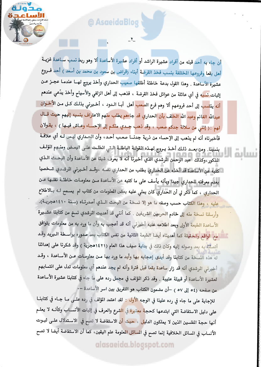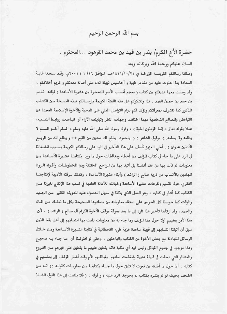 مساحة للباحثين المجموعة الثانية الرسالة الثانية إلى الأخ بندر بن فهد الفرهود ردا على المغالطات الواردة في كتاب ناصر بن حمد الفهد حول نسب الأساعدة عام 1421 هـ 2001 م