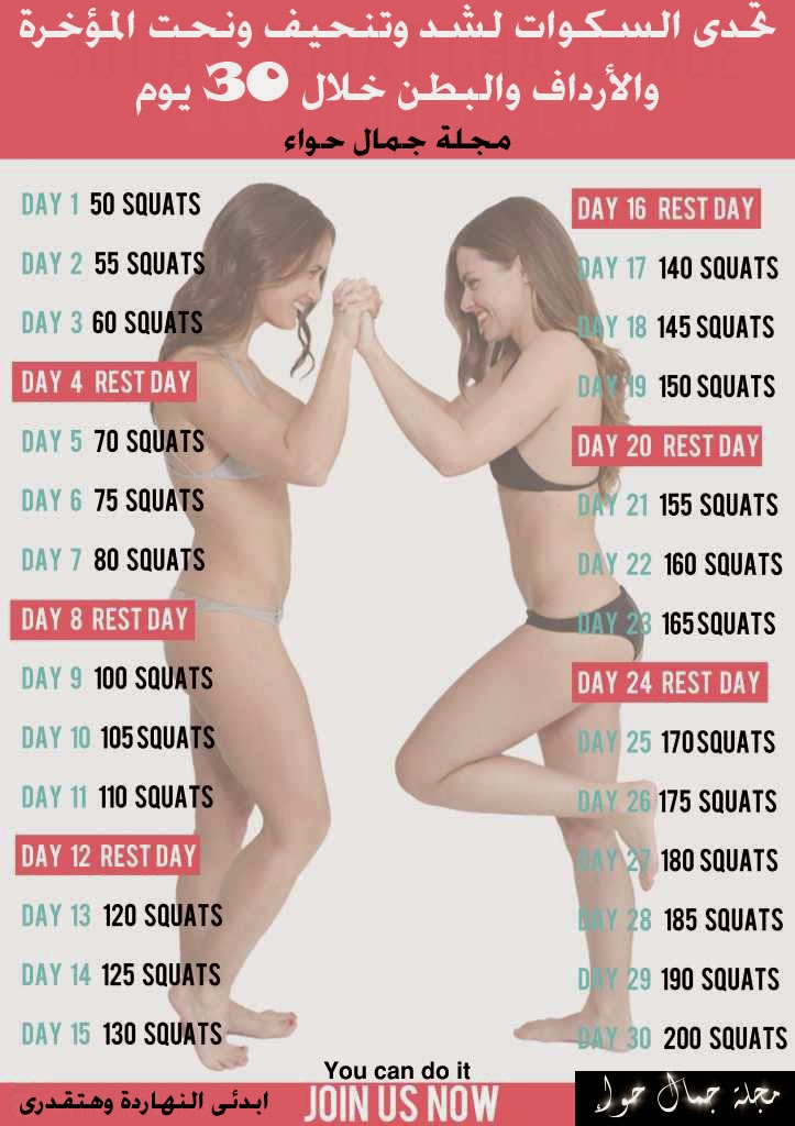 30 يوم تحدى تمرين سكوات لشد ونحت المؤخرة والبطن والأرداف مجلة جمال حواء