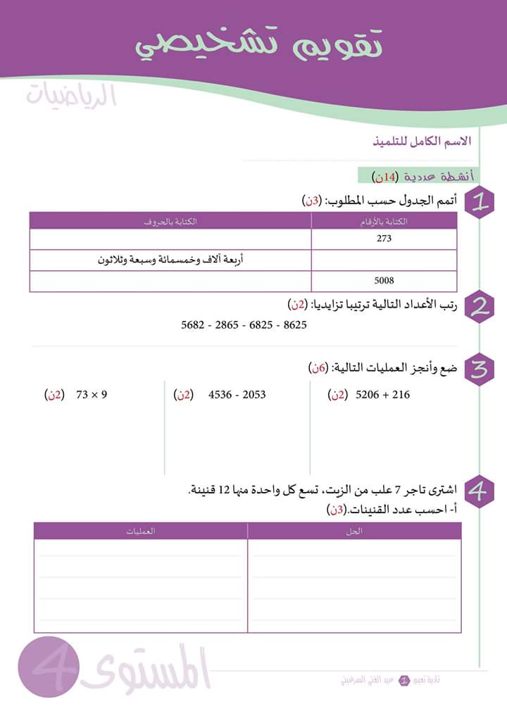 التقويم التشخيصي للرياضيات من كتاب التلميذ للمستوى الرابع ابتدائي