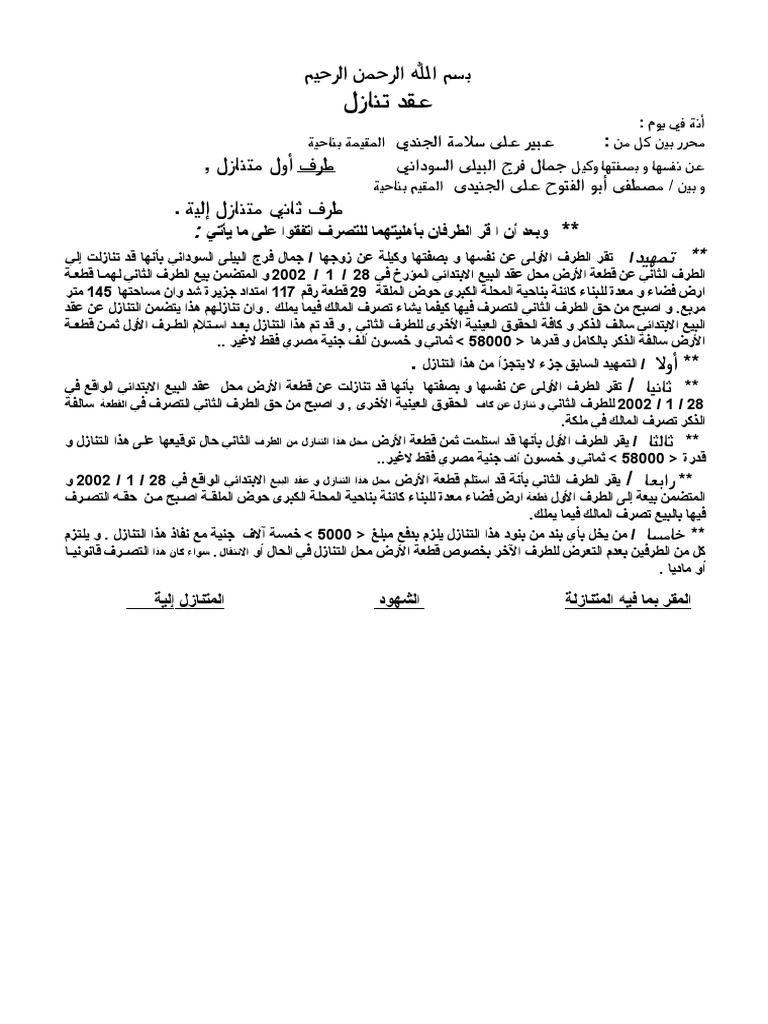 صيغة عقد تنازل عن قطعة ارض